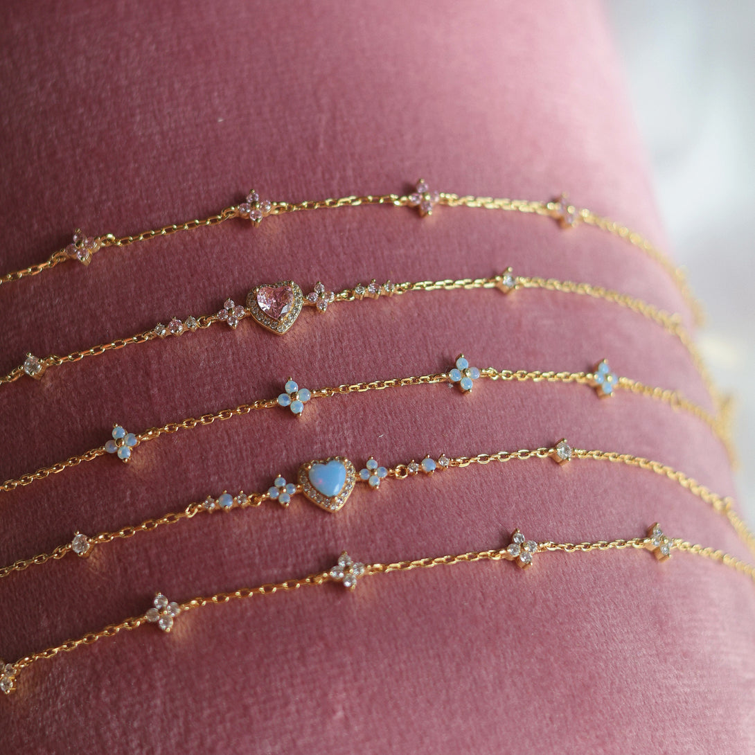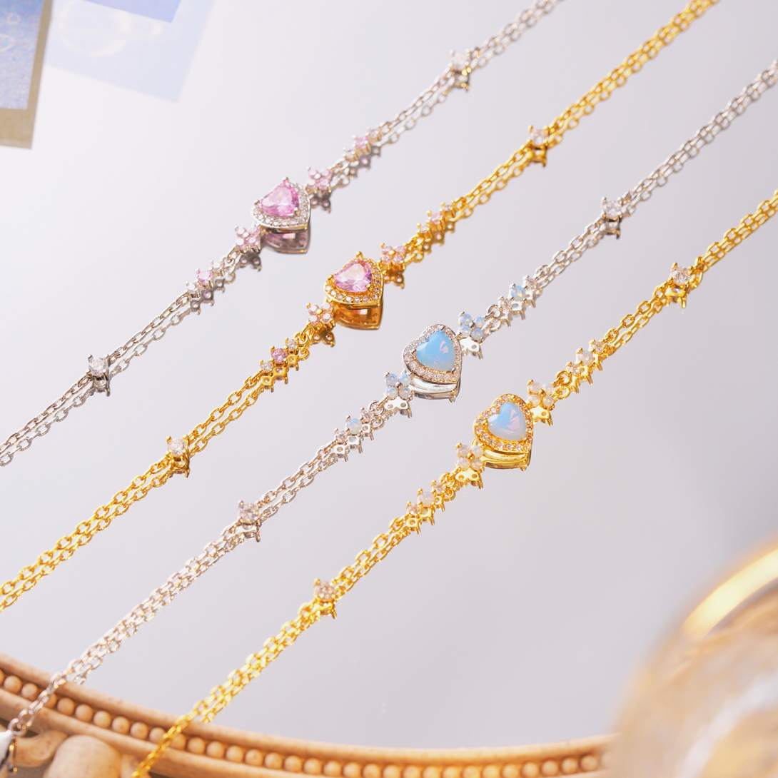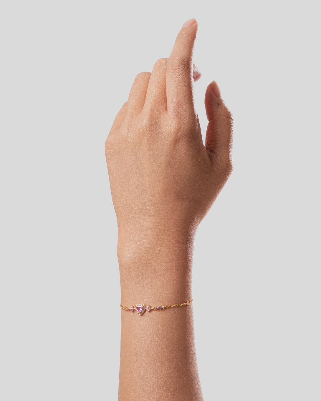 Ukrašena rozim ili crvenim cirkonom u obliku srca, ova narukvica nosi simboliku ljubavi i pažnje.