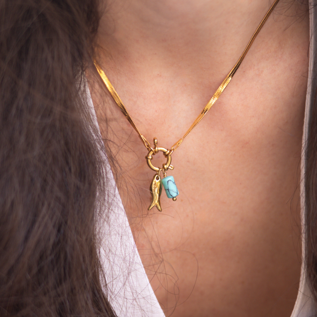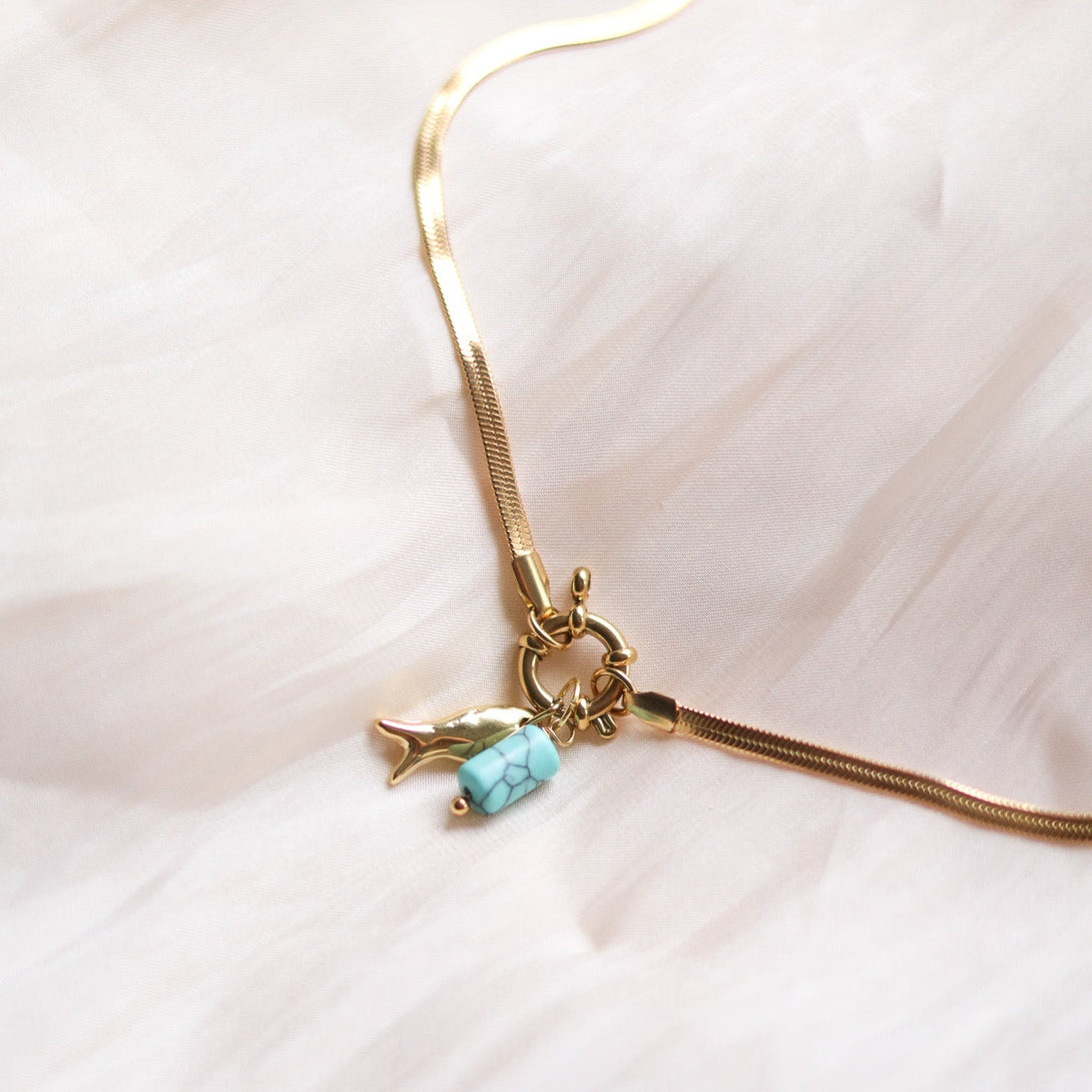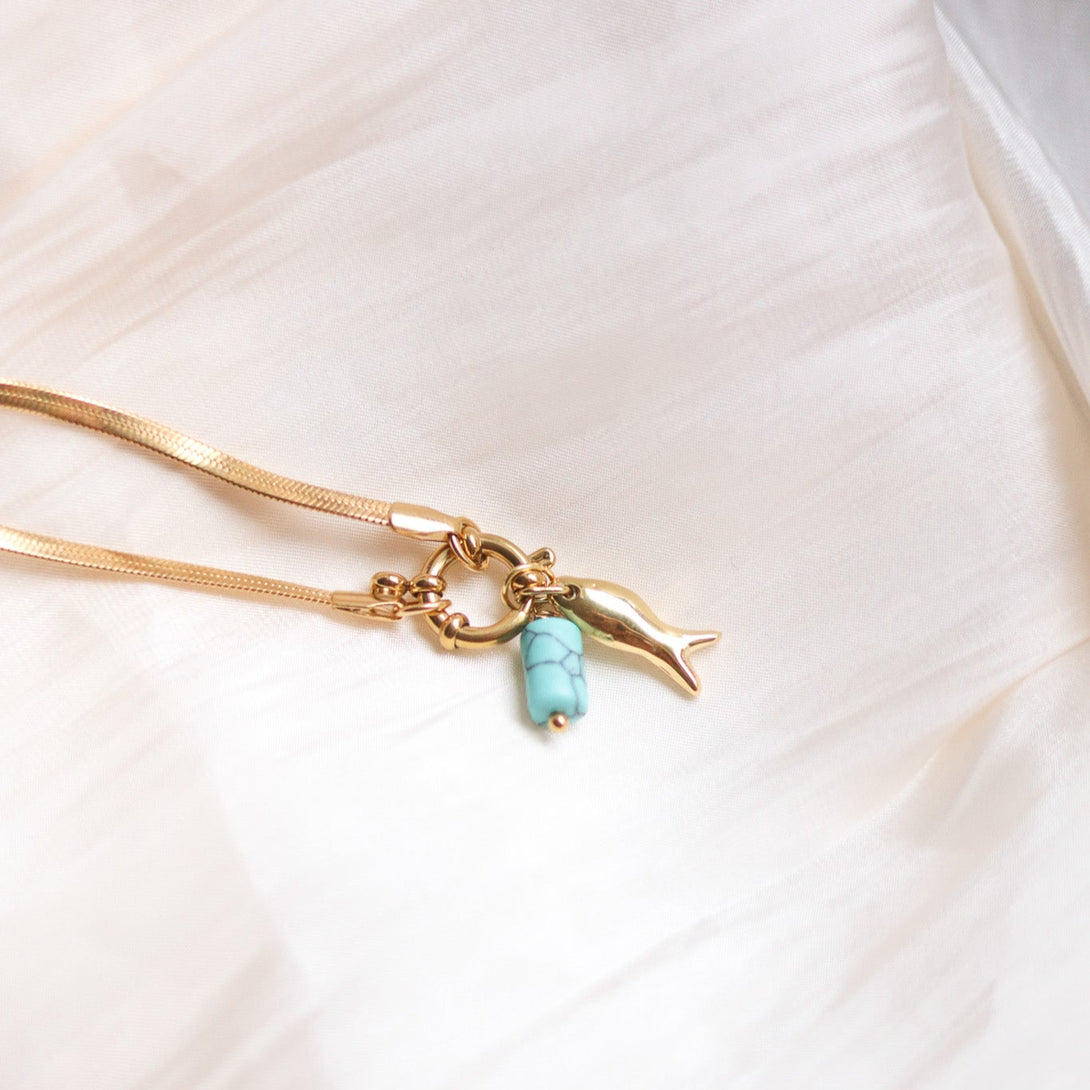 Azzurra Charm spaja pozlaćenu ribicu s tirkiznom perlicom u obliku morskog kamena.