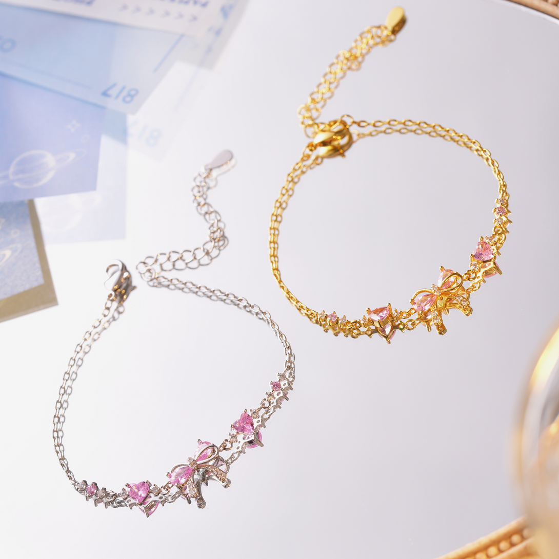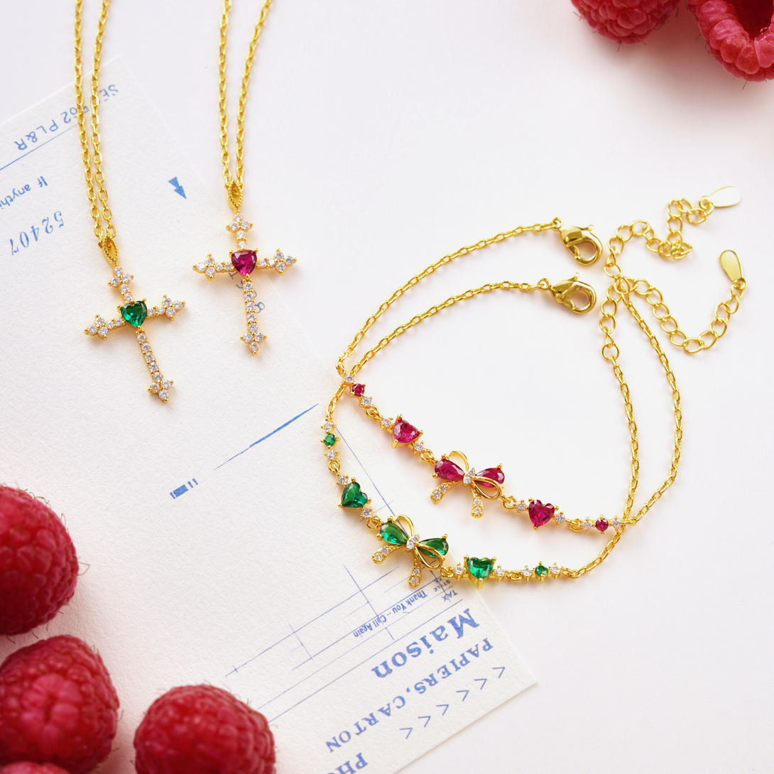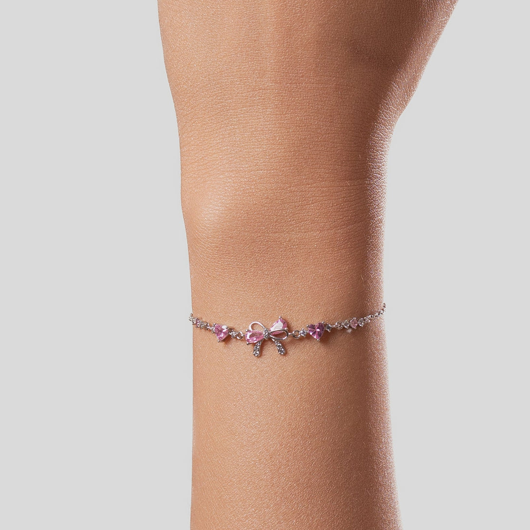 Ukrašena malim mašnicama sa sjajnim cirkonima u ružičastoj, crvenoj i zelenoj boji, ova narukvica spaja osjećajnost i veselu energiju – idealna za poklon ili kao mali znak pažnje prema sebi.