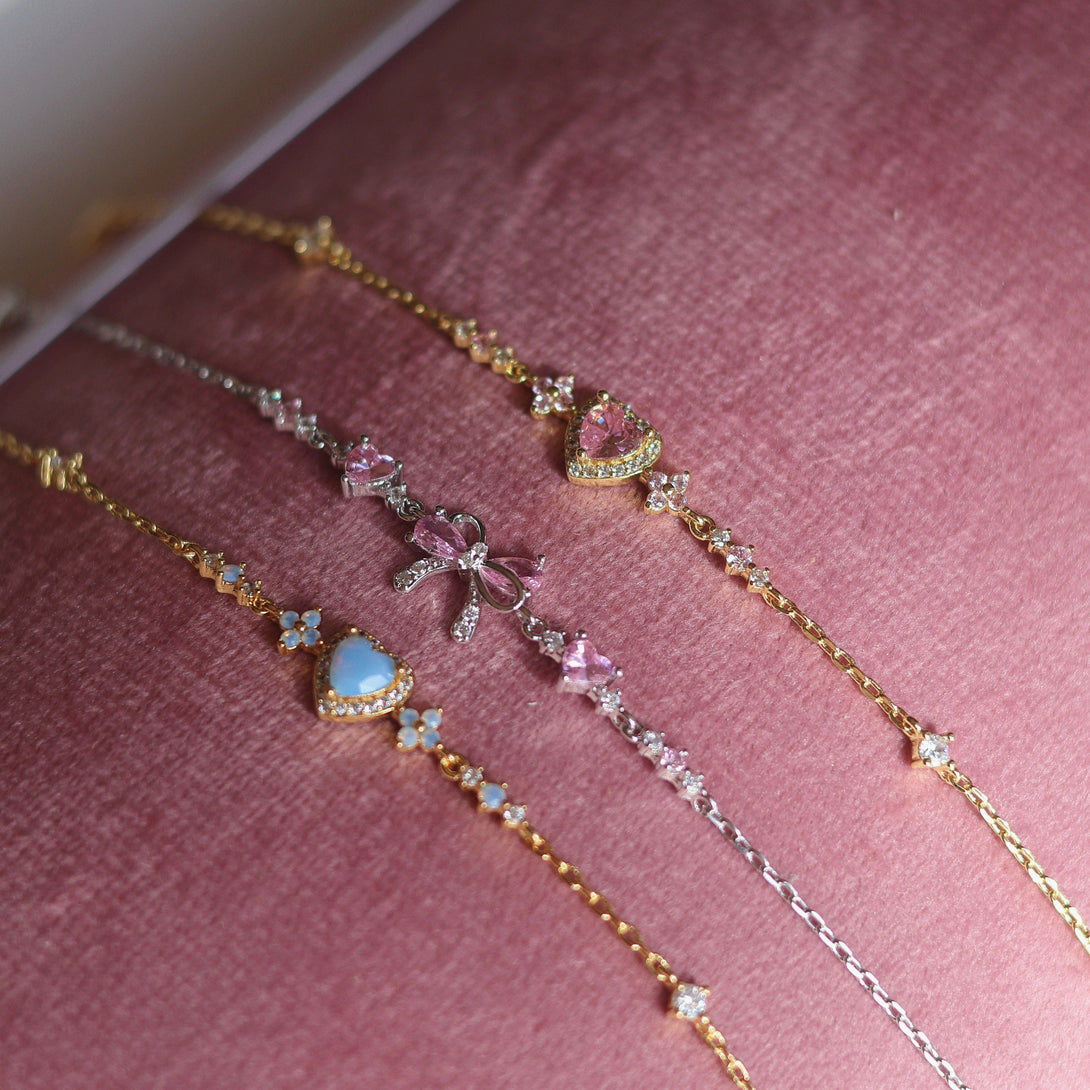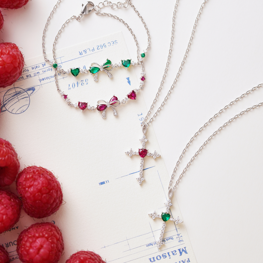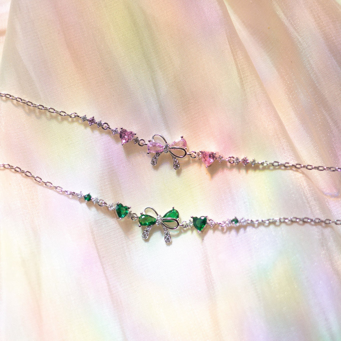 Ukrašena malim mašnicama sa sjajnim cirkonima u ružičastoj, crvenoj i zelenoj boji, ova narukvica spaja osjećajnost i veselu energiju – idealna za poklon ili kao mali znak pažnje prema sebi.