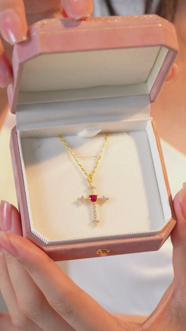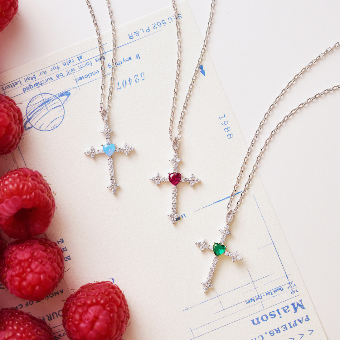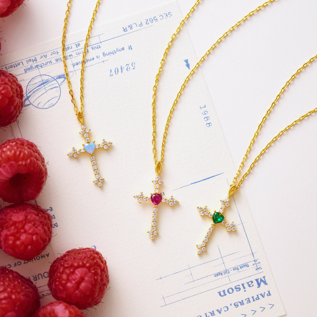 Križić je ukrašen sjajnim cirkonima u obliku srca, dostupnim u crvenoj, plavoj ili zelenoj varijanti – za dašak osobnosti i boje. ✝️