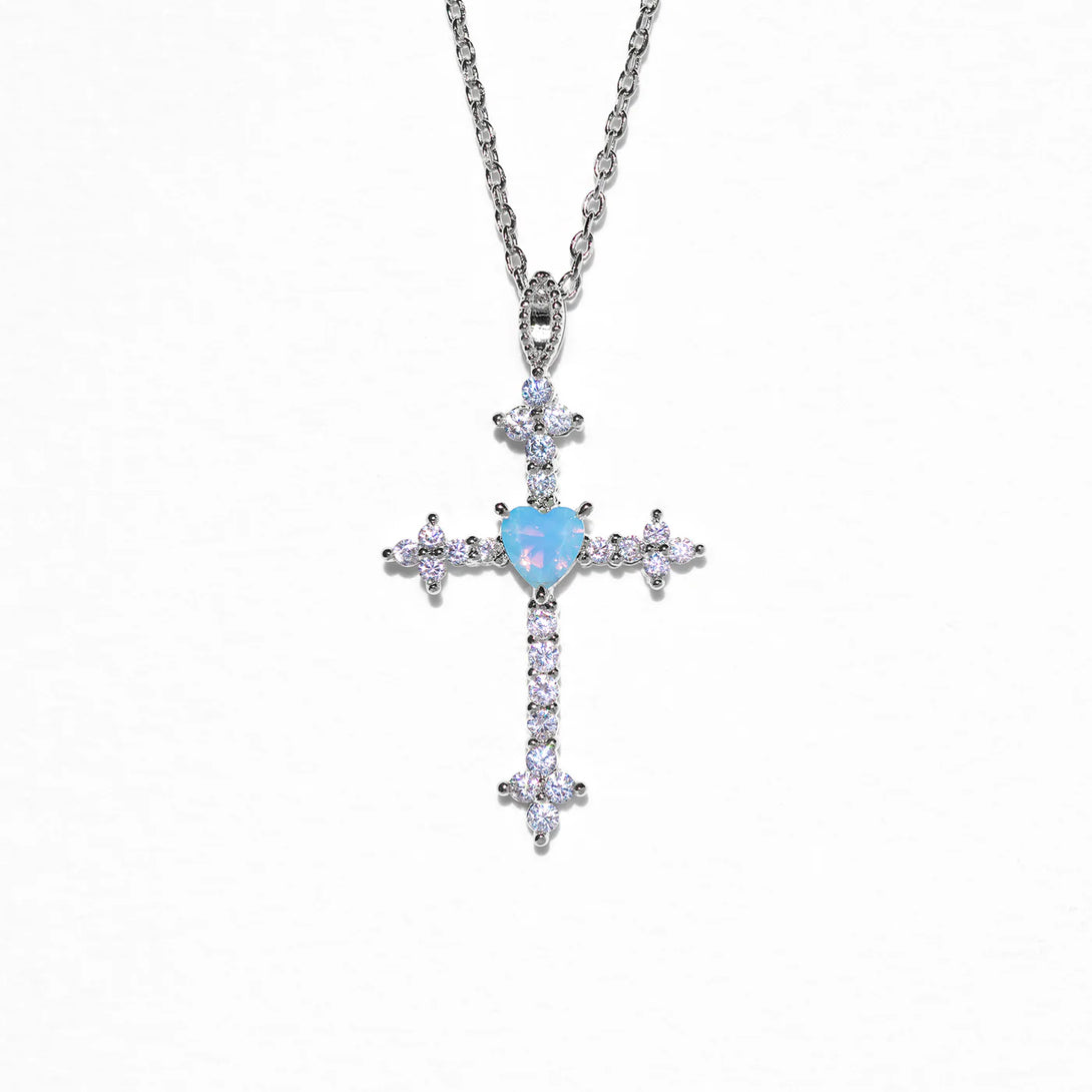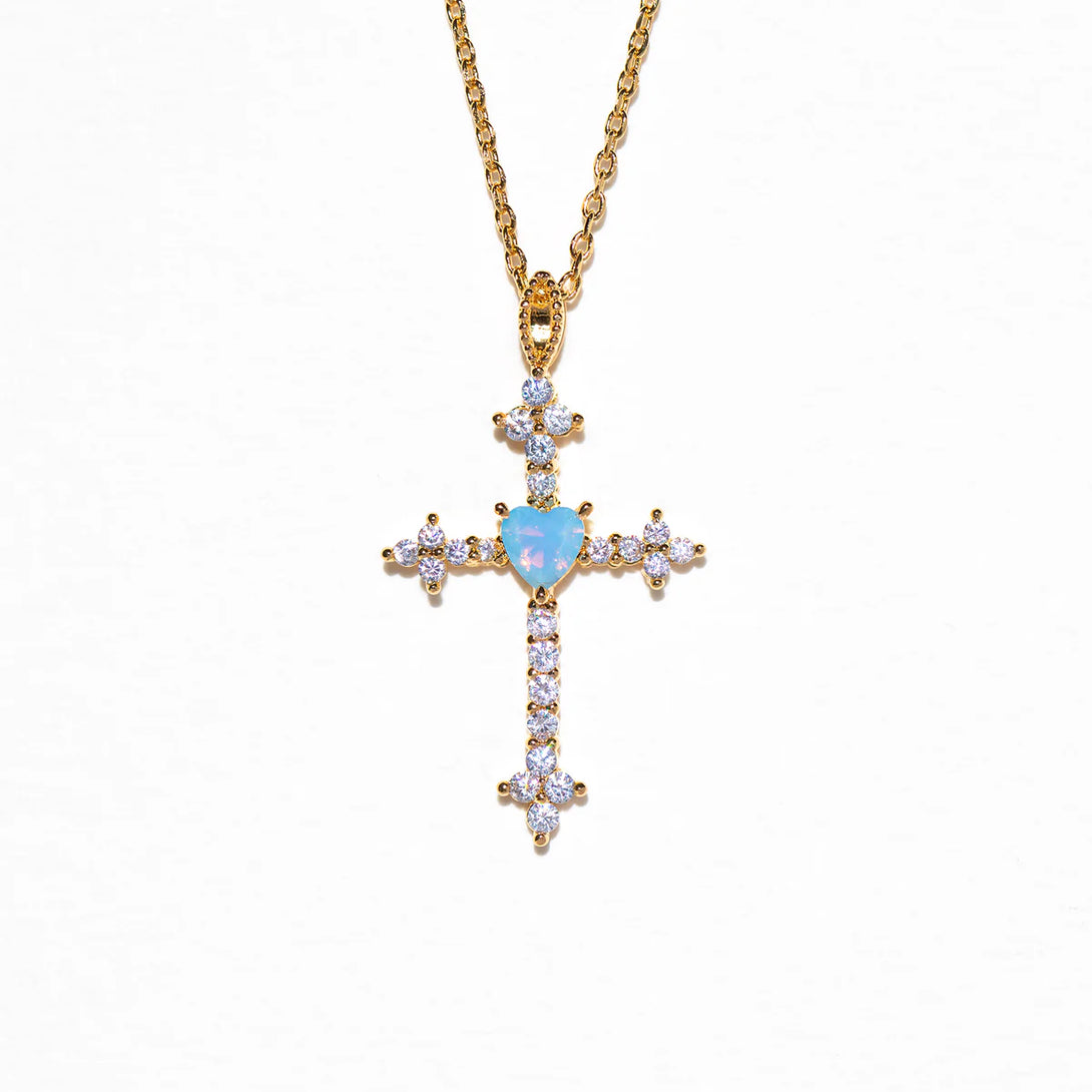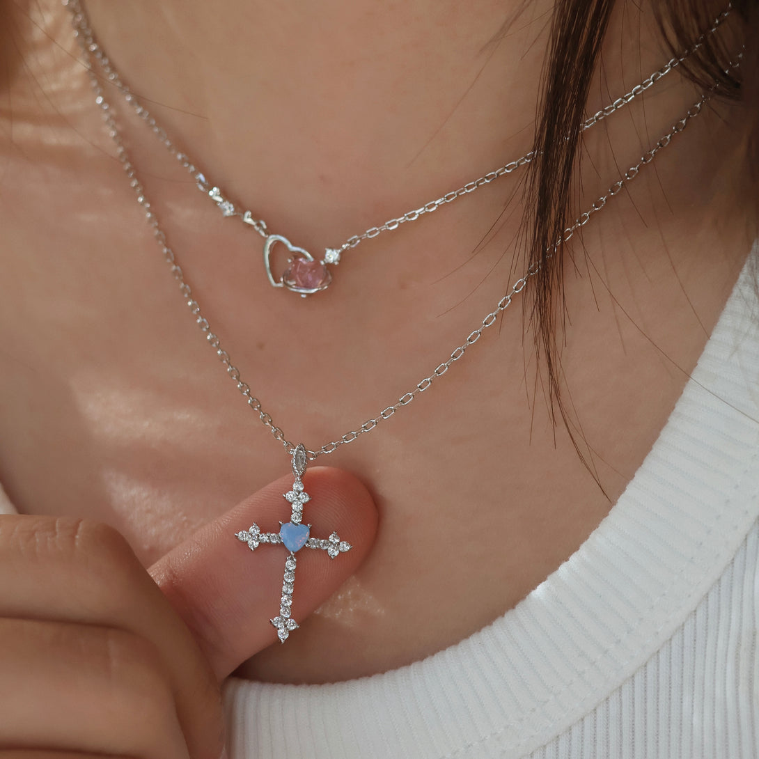 Križić je ukrašen sjajnim cirkonima u obliku srca, dostupnim u crvenoj, plavoj ili zelenoj varijanti – za dašak osobnosti i boje. ✝️