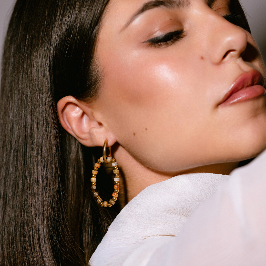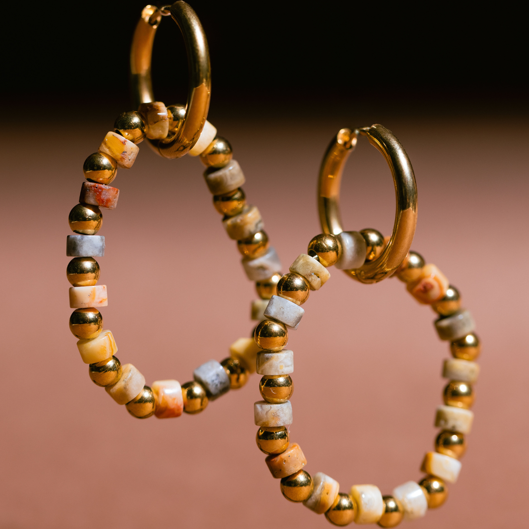 Gaia Hoops izrađene su od nehrđajućeg čelika presvučenog 18K pozlatom i ukrašene perlicama od prirodnog kamena u zemljanim tonovima. Svaka perlica unosi suptilnu raznolikost i organsku ljepotu, stvarajući sklad između topline metala i teksture kamena.