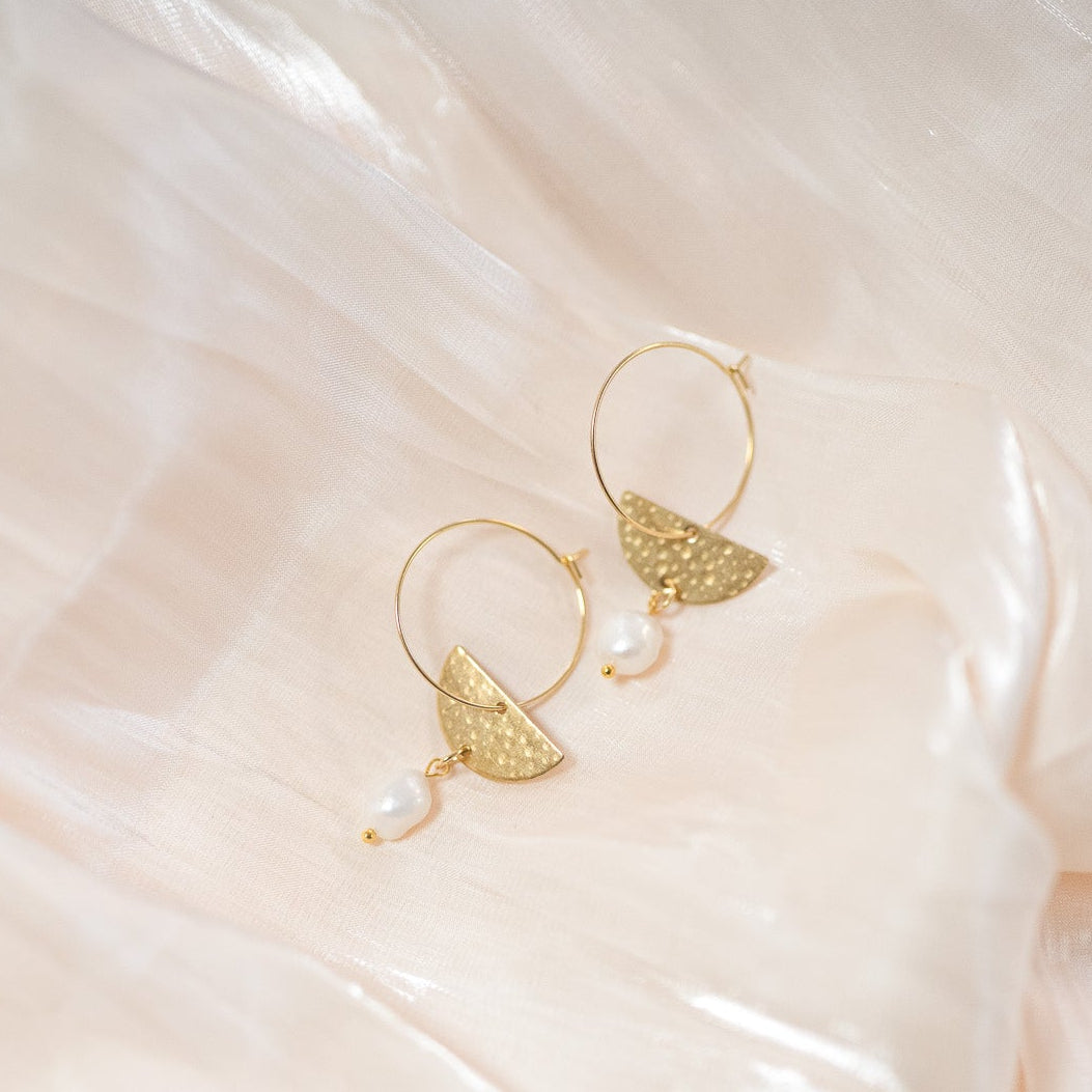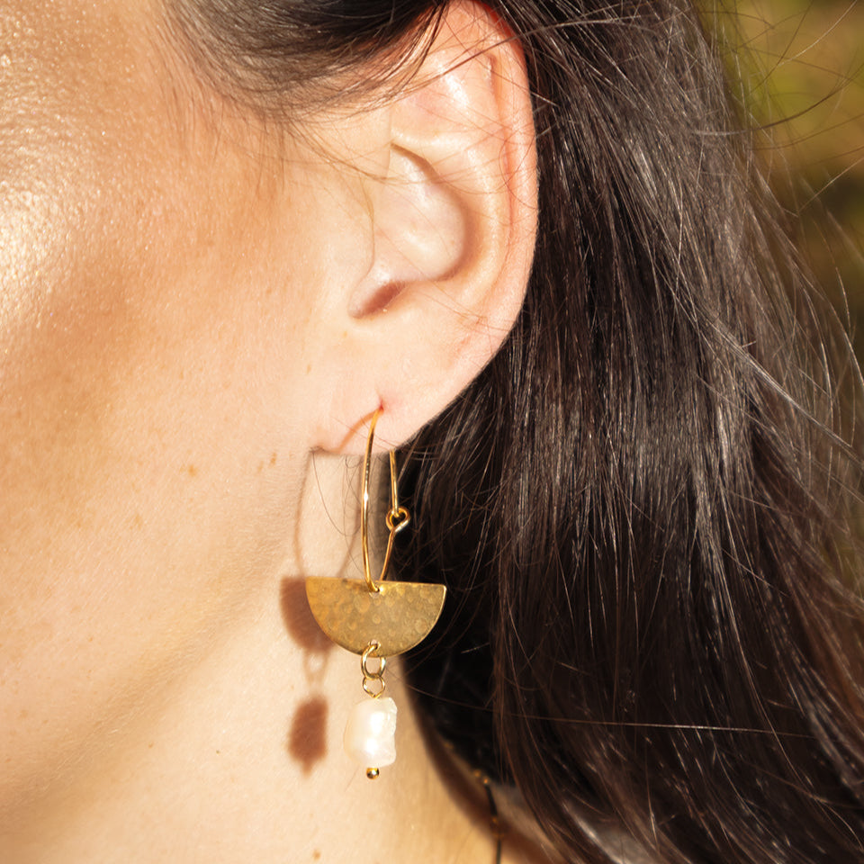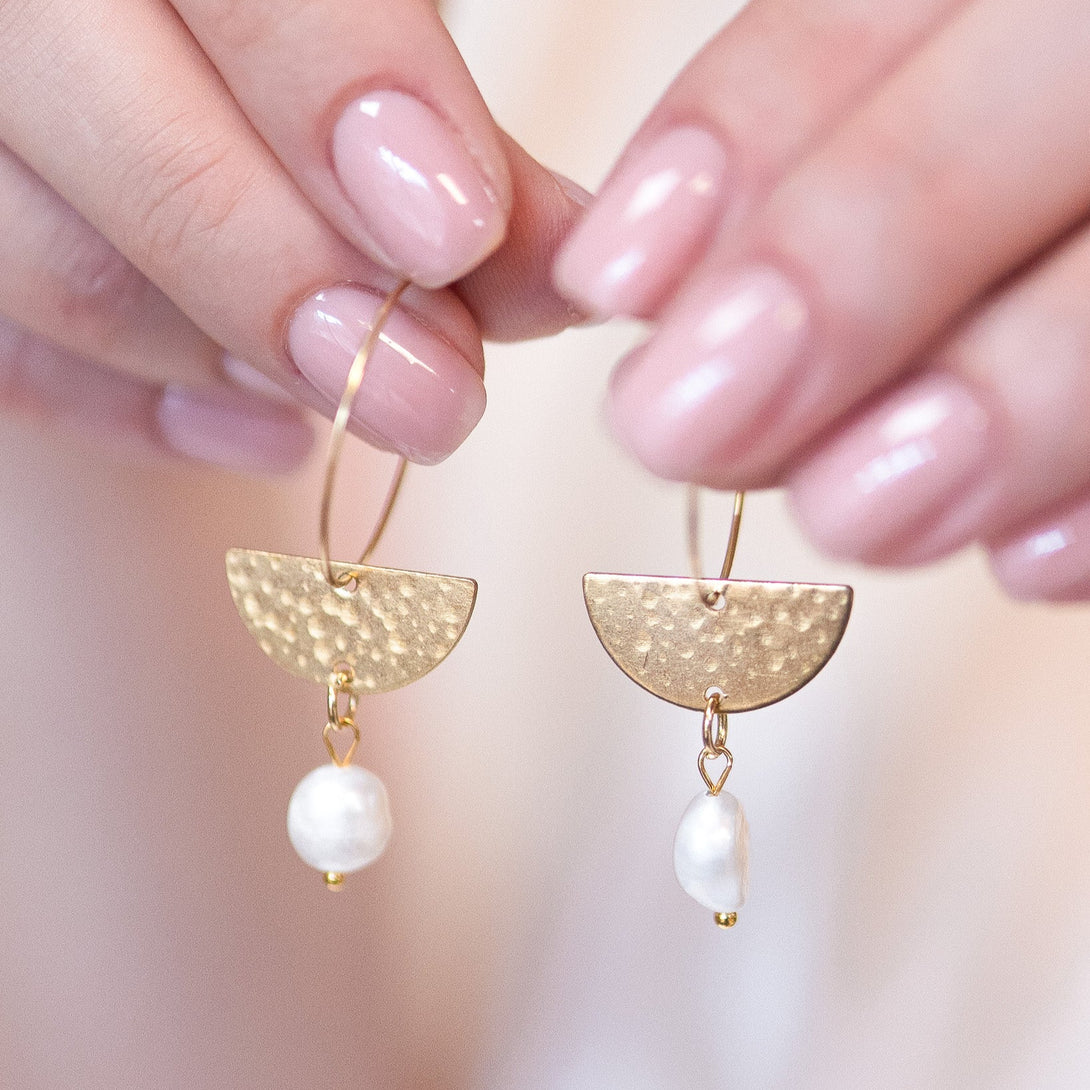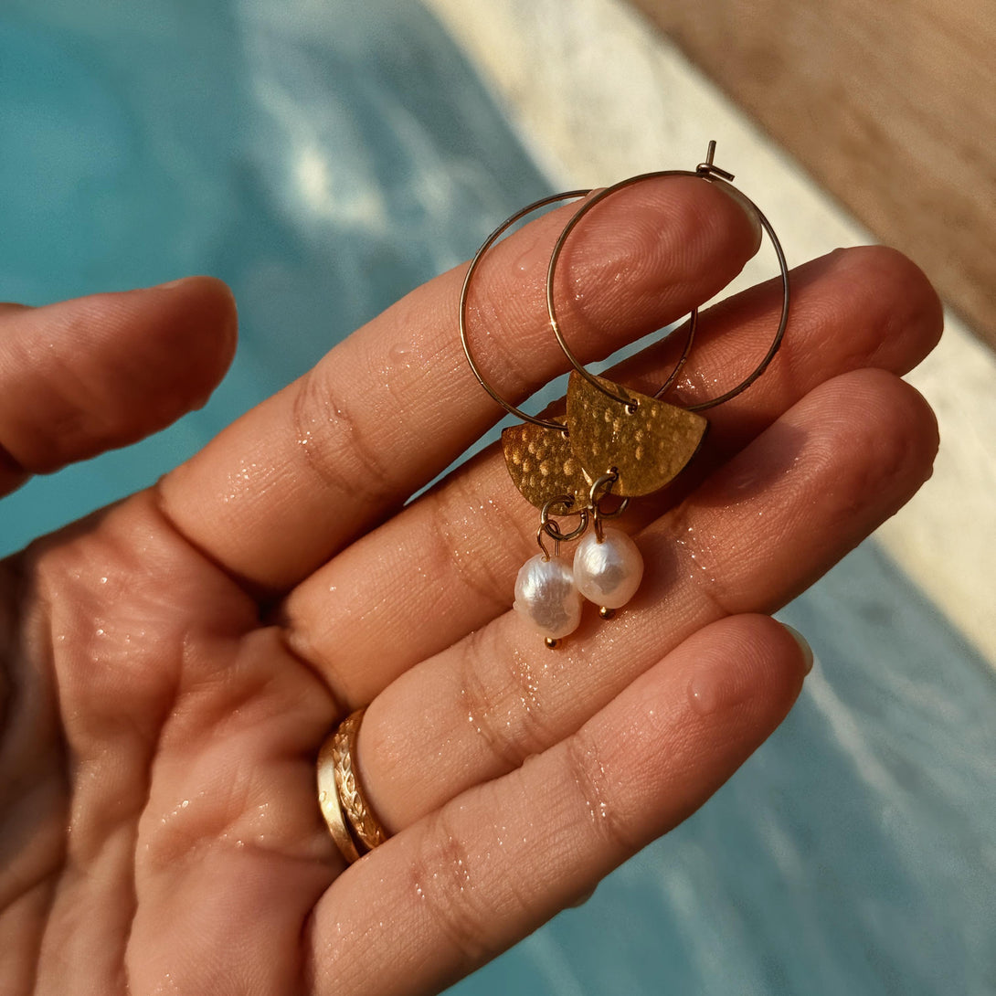 Napomena: Zbog udjela mjedi ne preporučuje se kontakt s vodom – materijal može s vremenom promijeniti boju. Moguća su mala odstupanja u veličini jer je svaki biser jedinstven, što tvoje naušnice čini još posebnijima.